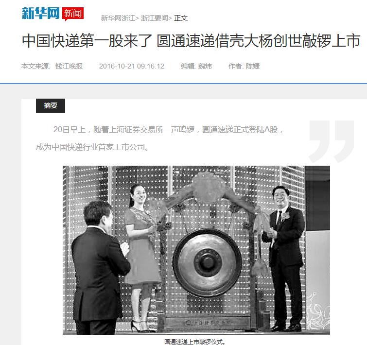 2016年10月20日上午9點30分,隨著在上海證券交易所一聲鳴鑼,圓通速遞股份有限公司正式登陸A股,成為中國快遞行業(yè)首家上市公司。