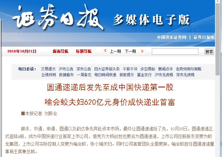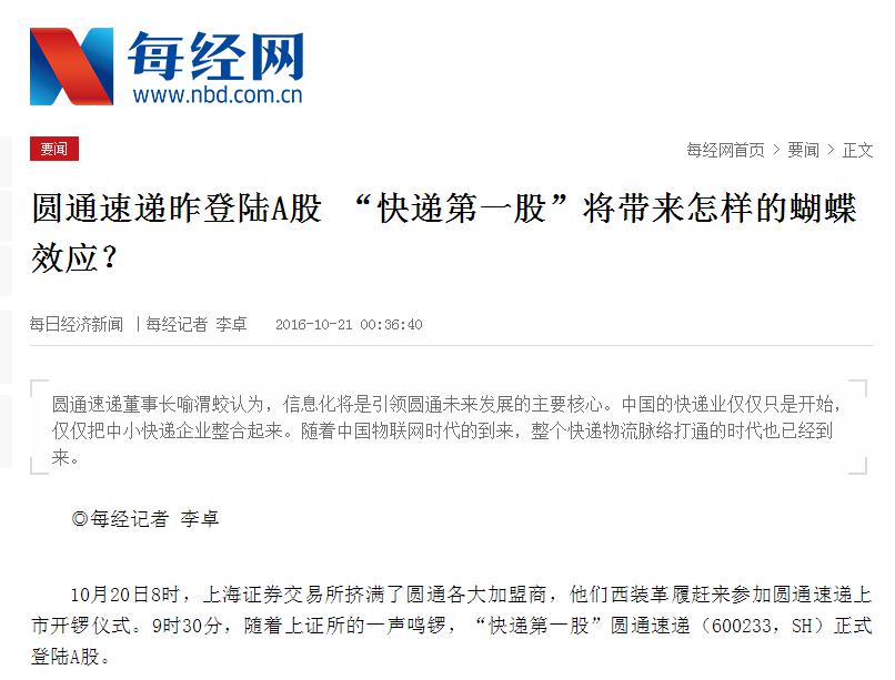 2016年10月20日上午9點30分,隨著在上海證券交易所一聲鳴鑼,圓通速遞股份有限公司正式登陸A股,成為中國快遞行業(yè)首家上市公司。 圓通速遞成功上市的消息引起了各大媒體的熱切關(guān)注。新華網(wǎng)、中華工商時報、新京報、每日經(jīng)濟(jì)新聞、第一財經(jīng)、經(jīng)濟(jì)觀察報、證券日報、新聞晨報、南方都市報、錢江晚報等近百家媒體對此紛紛進(jìn)行宣傳報道,轉(zhuǎn)載量達(dá)千余次。 以下為部分媒體報道截圖: